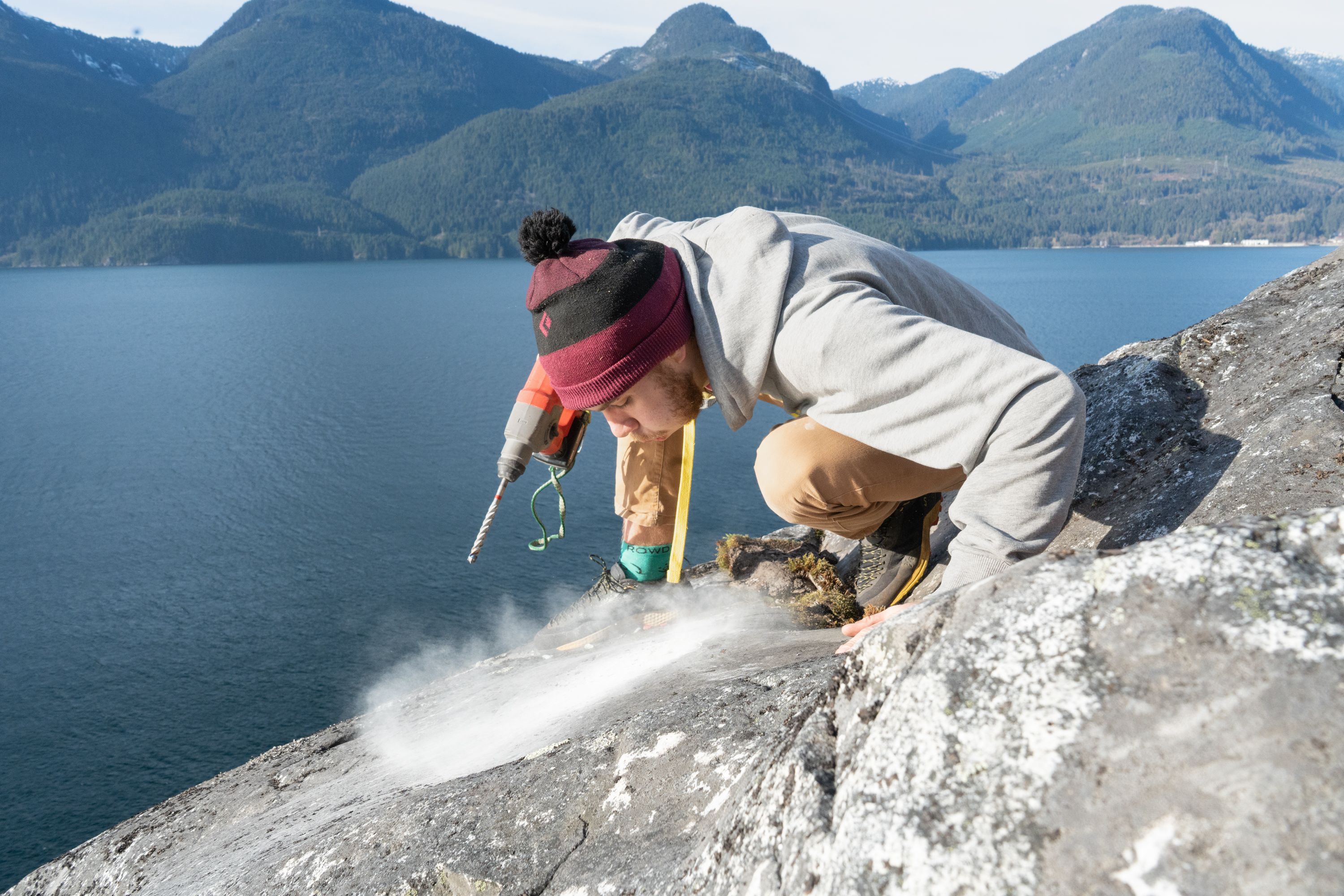 Drilling into solid rock takes effort. Matthieu and Shaun took turns boring into granite. Before they could bolt, Matthieu realized he forgot some equipment needed for bolting. Evan Willson headed back to Squamish to get the missing tools. Shortly after, one of their drills started to lose power. Matthieu called Evan, who went and picked up another drill. Rigging is a team effort, and the communities' problem-solving ability is part of the sport.