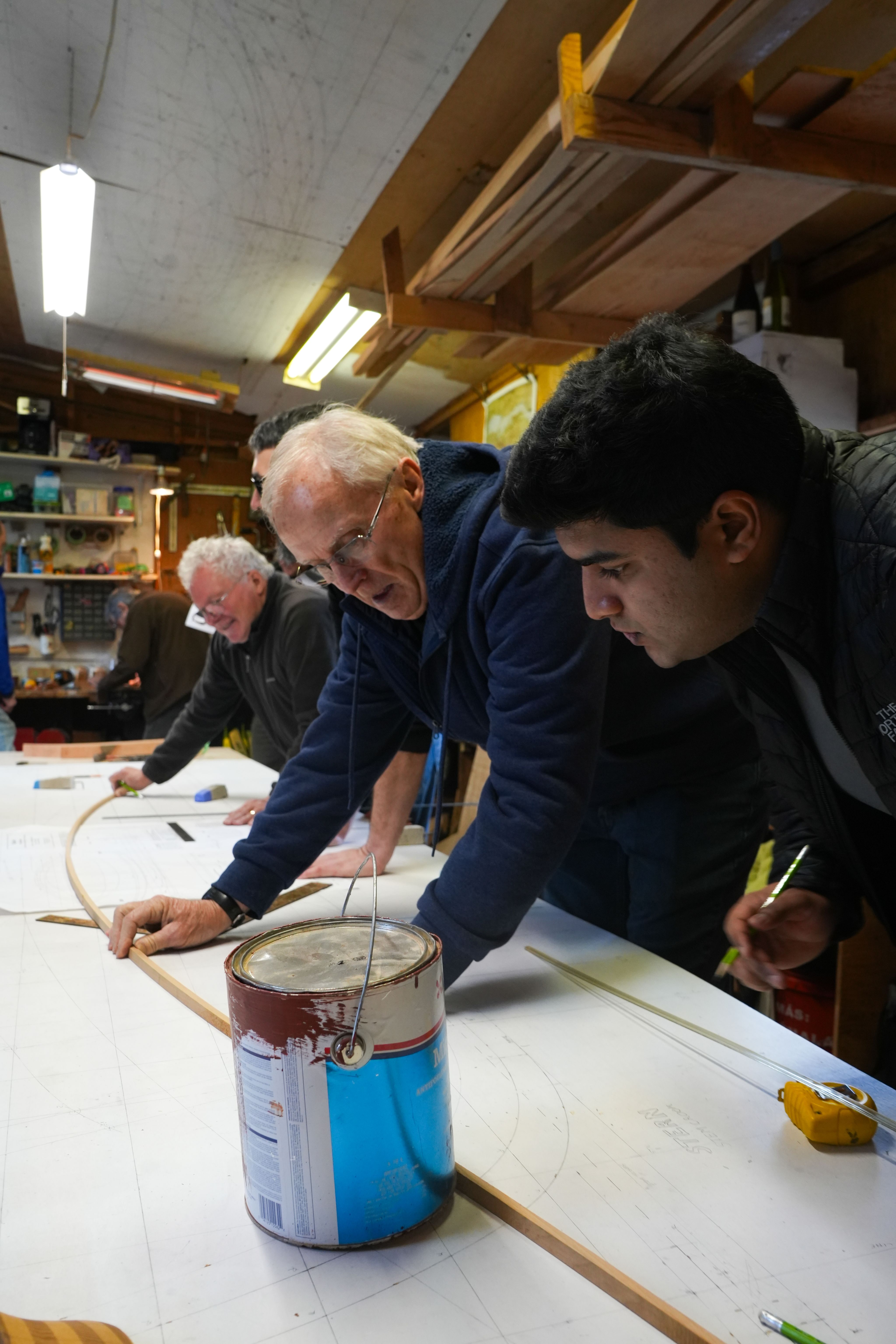 The members with more experience guide the newer members through the layered process of building a wooden boat. This informal method of sharing information has seen a great response. As people learn to do the basics, they get excited about picking up more advanced skills. Eventually they “come in one week and say that I bought my first saw and I am making a shelf”.