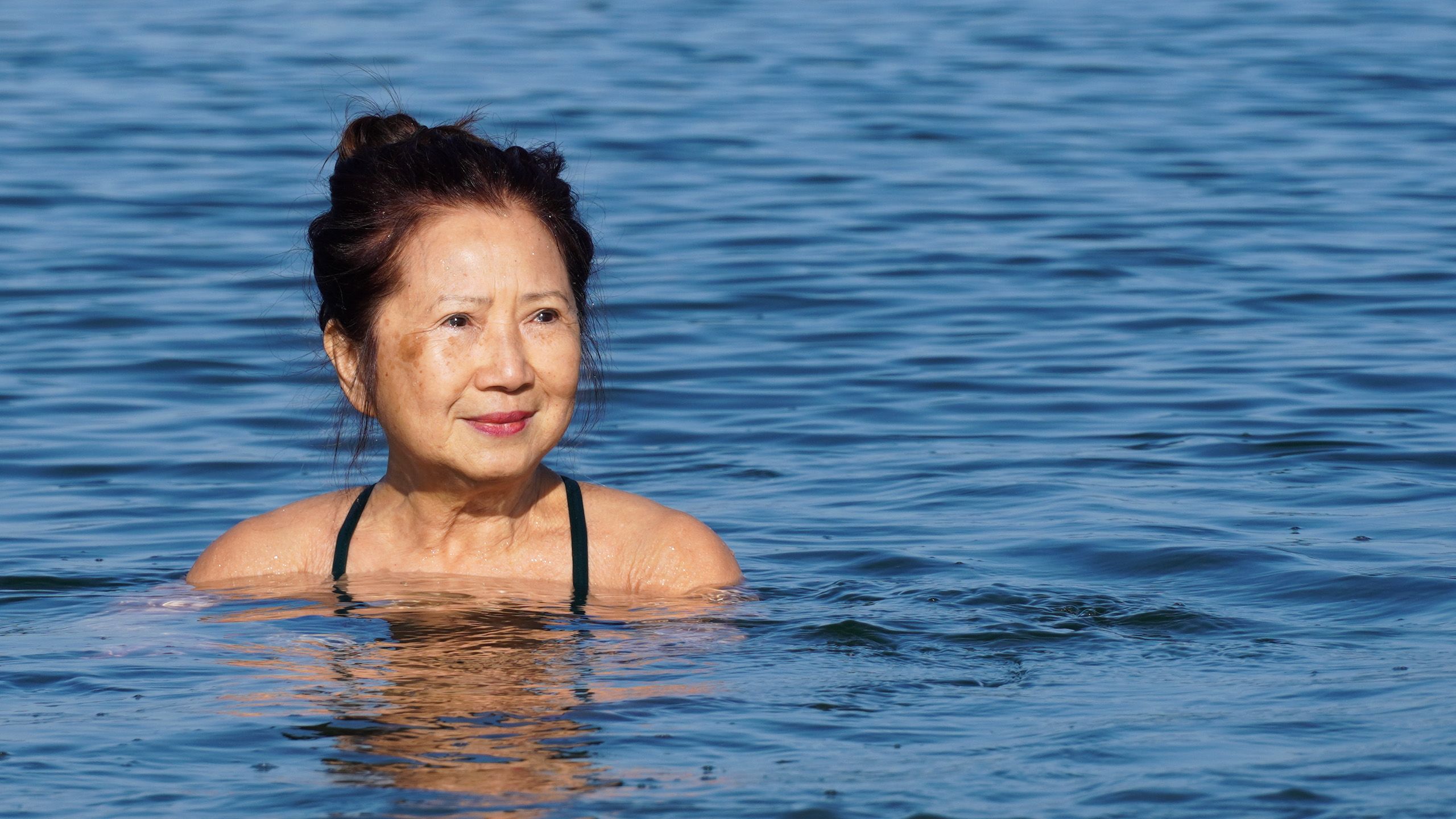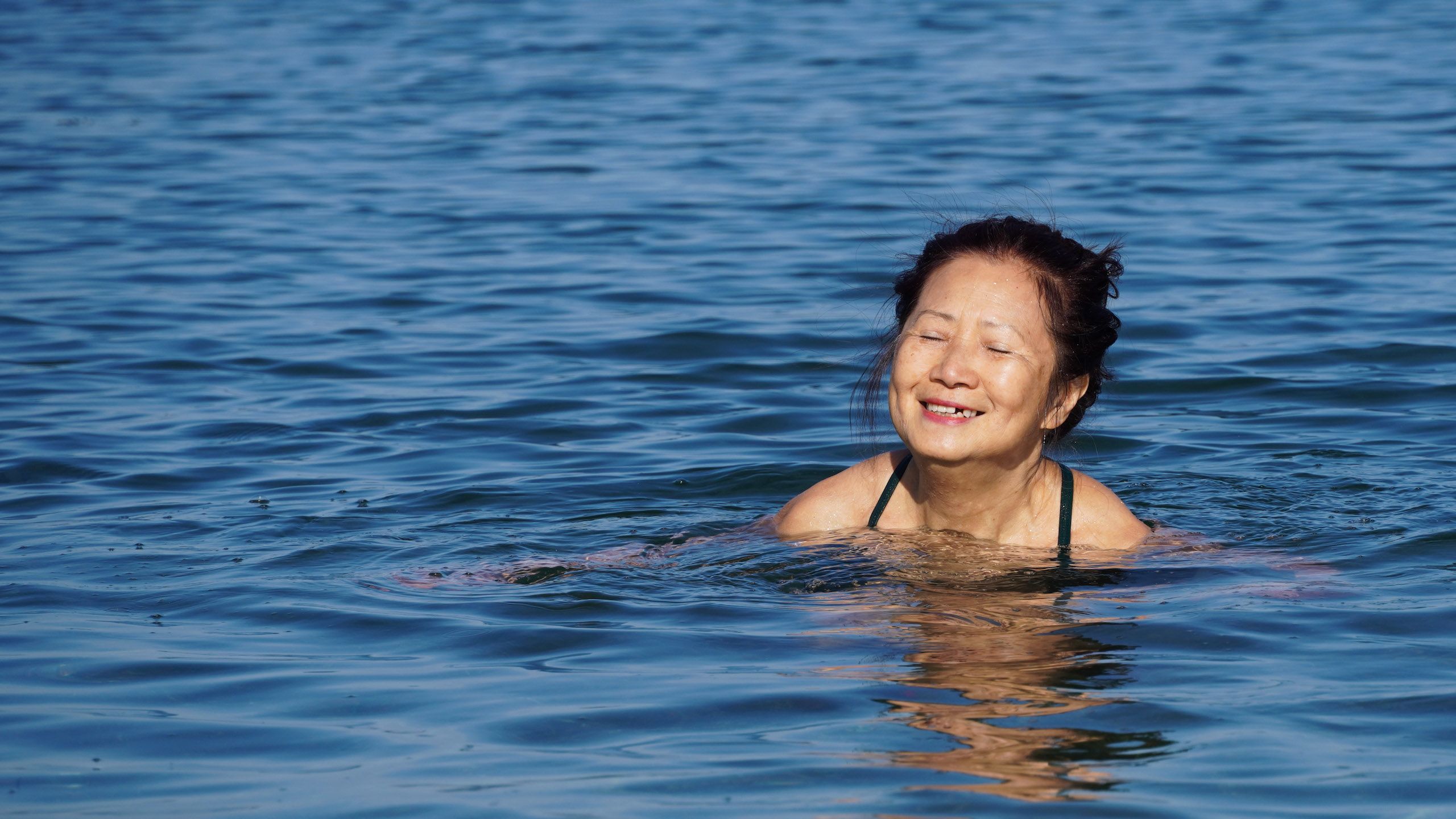I live a really good life. The only downside is, at my age, it’s easy to fall into complacency. But this gives me a routine and it’s really refreshing. You come out here and look at the mountains and the water. It doesn’t matter if it rains. I take my umbrella and go into the water anyway. It’s delightful. You feel like the whole world is wrapping around you because all water is connected.