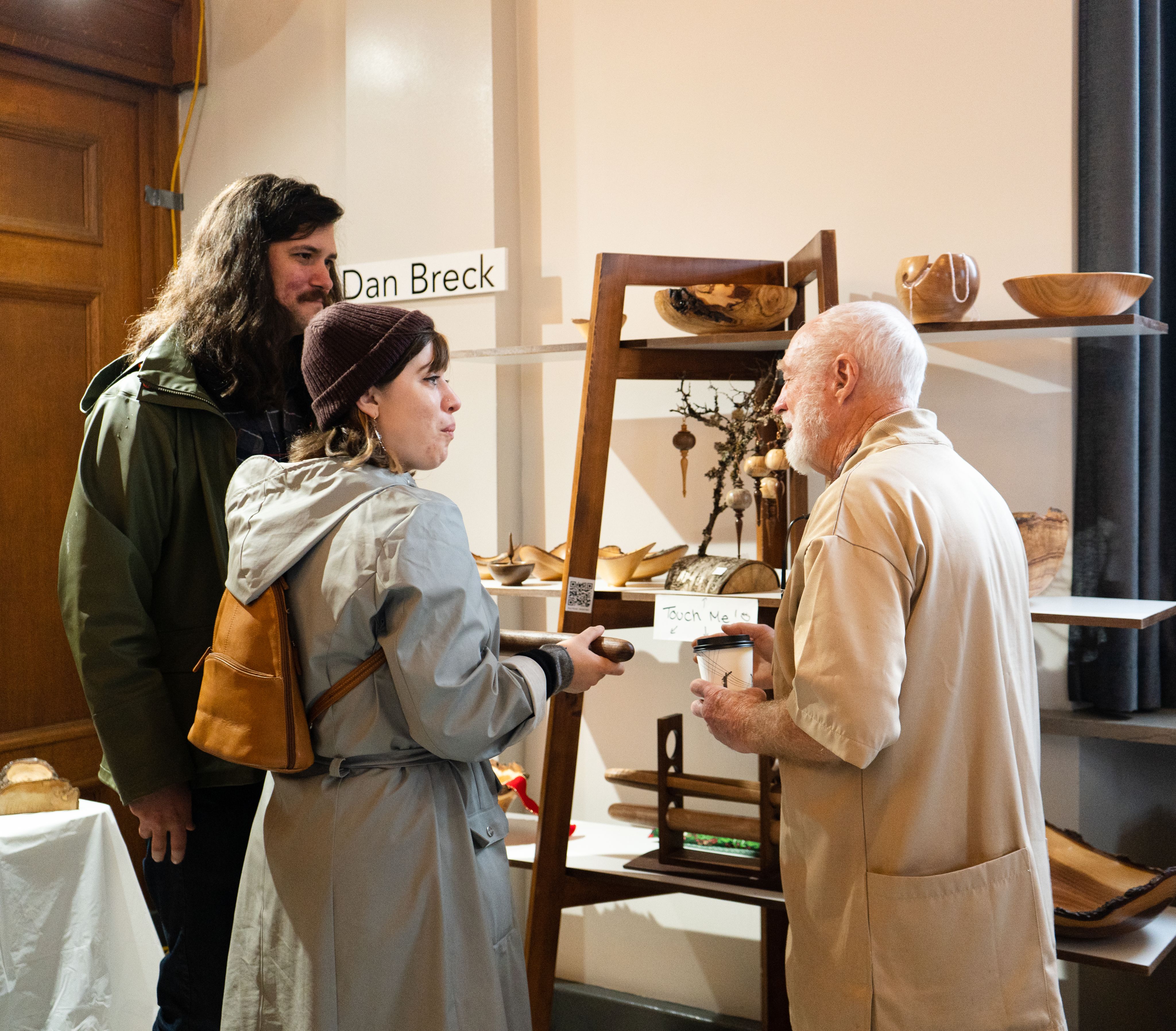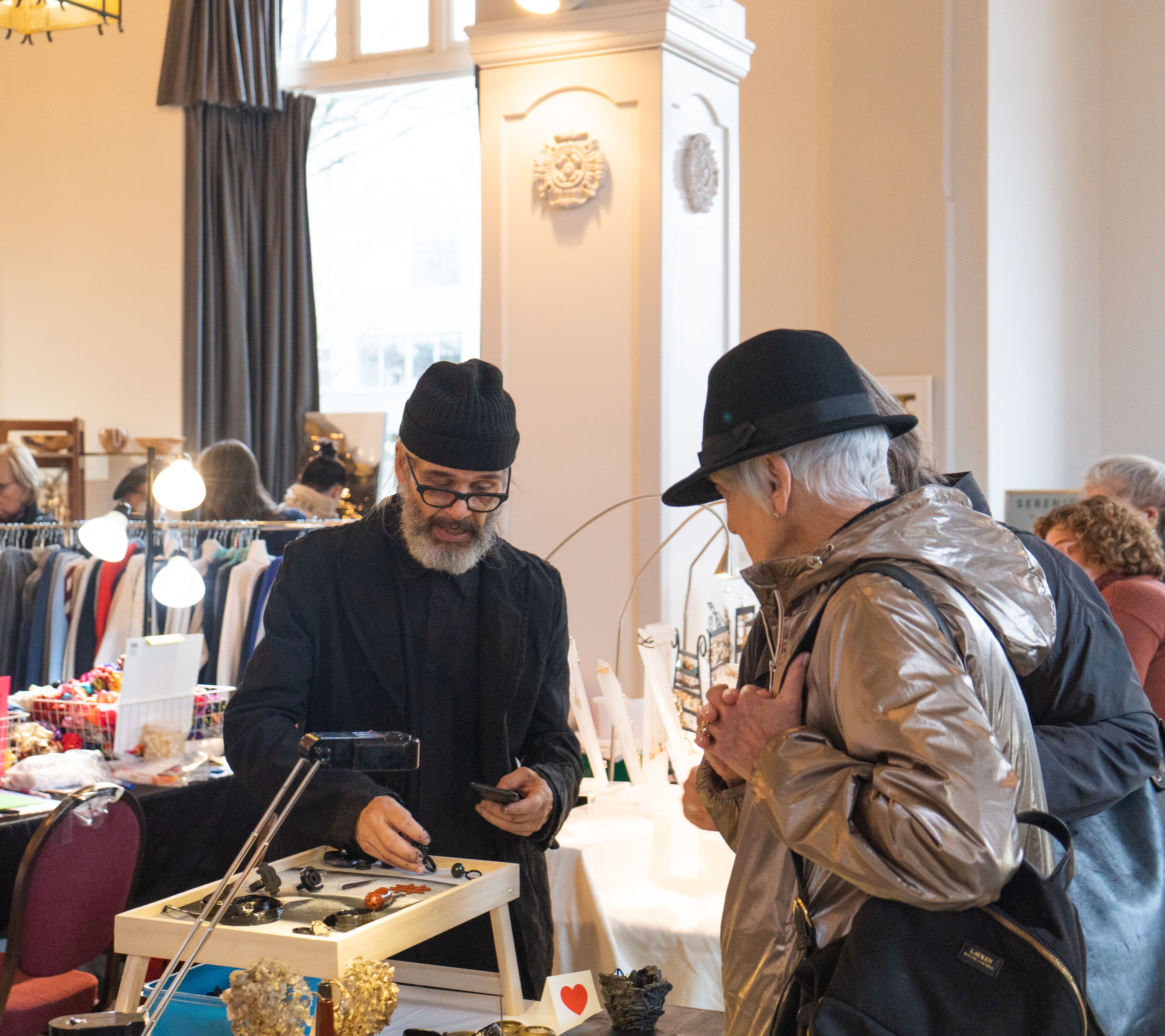 On an overcast December Saturday afternoon, over 20 artists and local businesses are gathered in Heritage Hall at 3102 Main Street. Music that is decidedly not Christmasy plays in the background. Unique handmade products from people across Vancouver ranging from jewelry to ceramics, fashion and art decorate the room, as does the large Christmas tree in the corner. Visitors stop at each, moving from one vendor to another, looking at the products, and asking questions. There are mostly smiles.